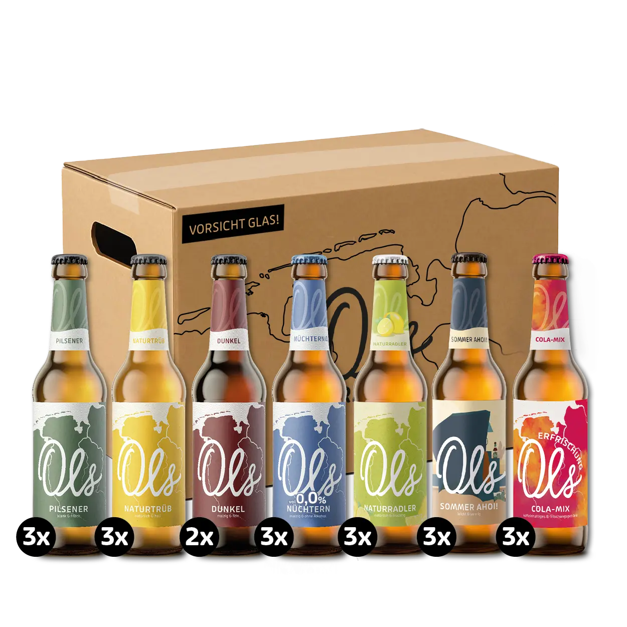 Biertypen: 3x Naturtrüb, 3x Pilsener, 2x Dunkel, 3x Nüchtern 0,0, 3x Naturradler, 3 x Sommer Ahoi!, 3 Cola Mix und